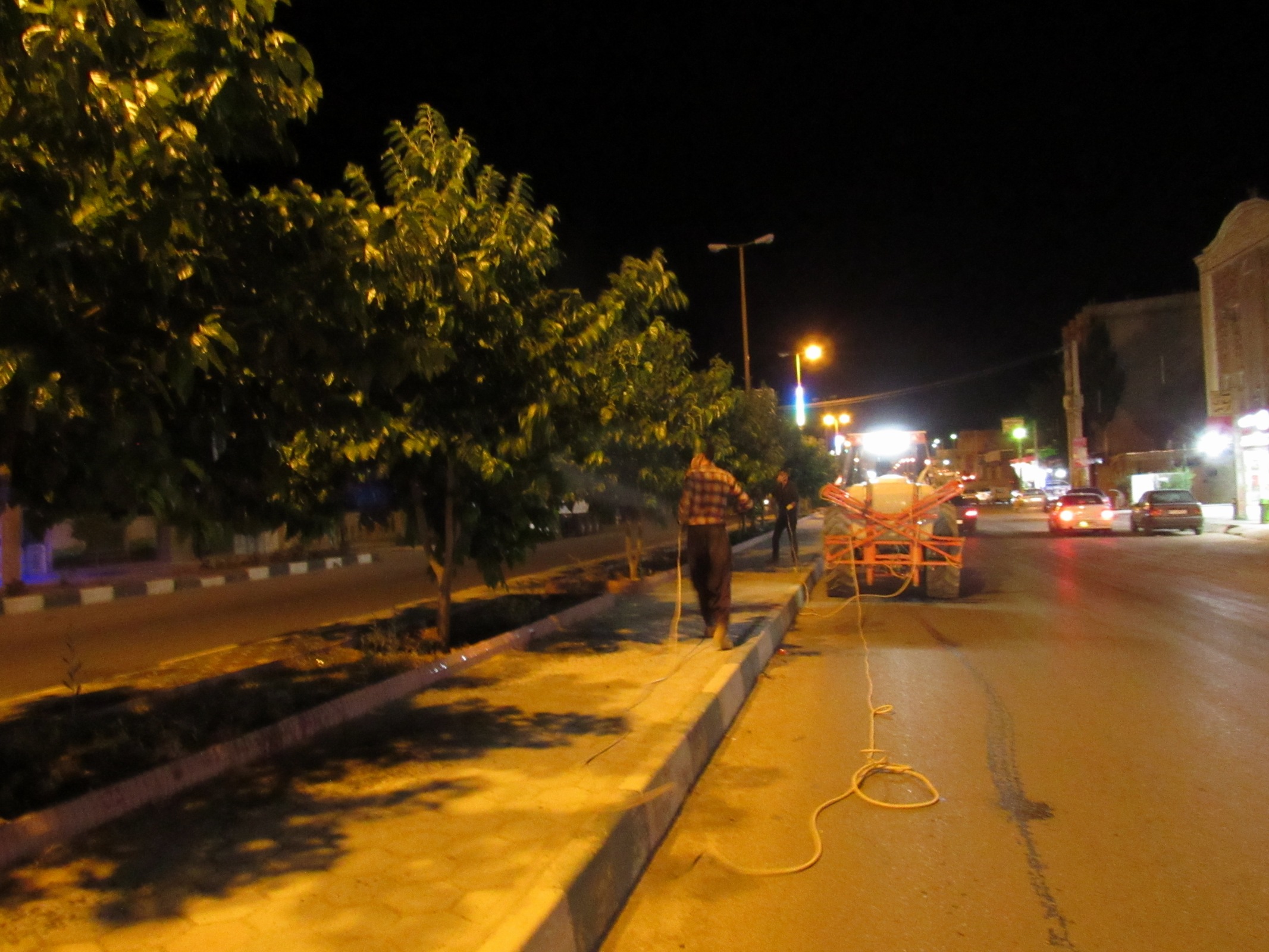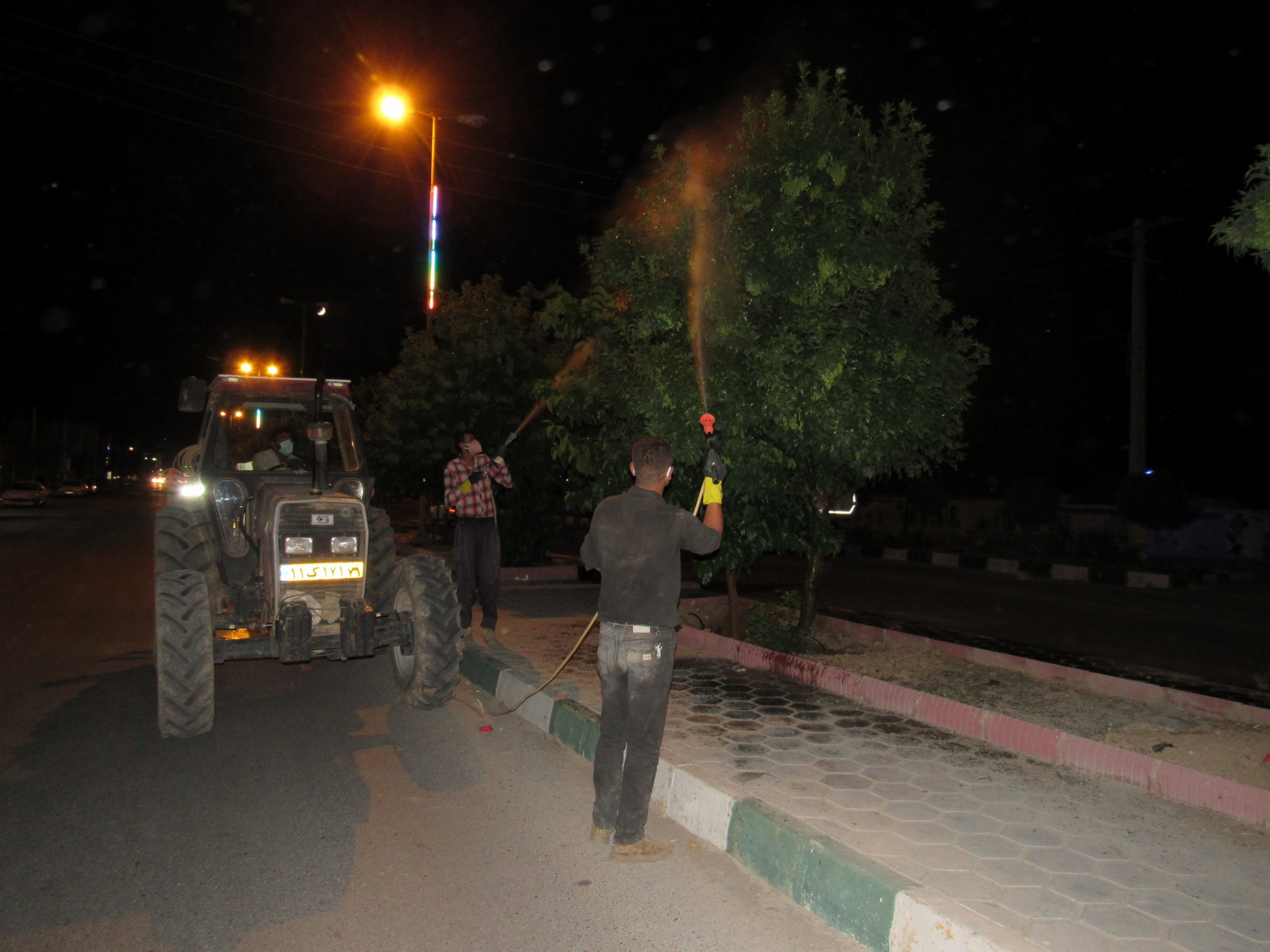 اجرای عملیات سم پاشی شبانه درختان سطح شهر نقنه به منظور مبارزه با آفات و حفظ و نگهداری درختان