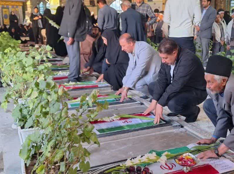 ️به گزارش روابط عمومي شهرداری نقنه؛ به مناسبت گرامیداشت هفته دفاع مقدس و نکوداشت یاد و خاطره ایثارگریها و جانفشانیهای رزمندگان ۸ سال دفاع مقدس مراسم غباروبی و گلباران قبور مطهر شهدای شهر نقنه در ششمین روز از هفته دفاع مقدس، با حضور مدیر کل حراست استانداری، خانواده معظم شهدا و جمعی از مردم، شهردار و اعضای شوراي اسلامي شهر نقنه، بسیجیان و دیگر مسئولین شهری برگزار شد.